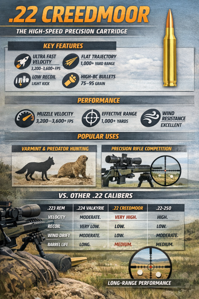 The .22 Creedmoor represents the modern evolution of high-speed, high-precision shooting. It combines blistering velocity, excellent ballistic performance, and low recoil into a cartridge that excels at long-range competition and varmint hunting.